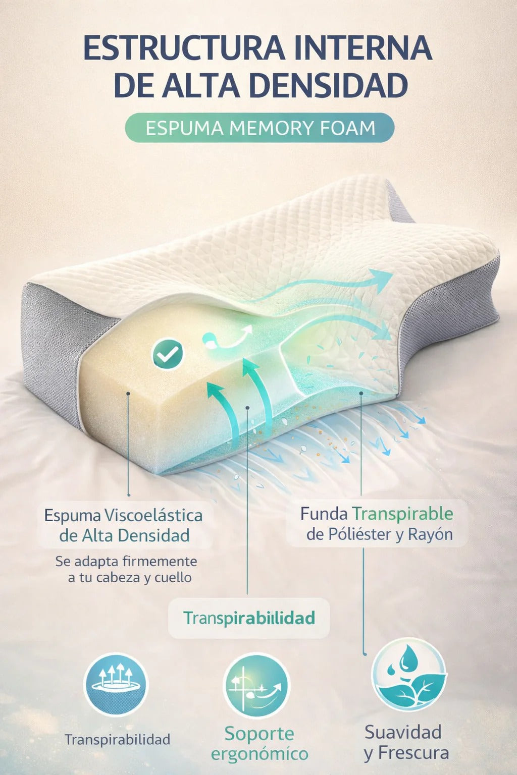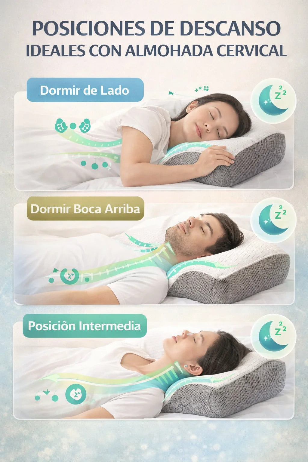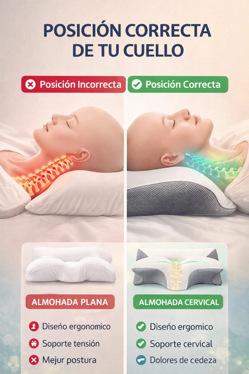 Esta almohada está diseñada para estirar suavemente el cuello y relajar los músculos cervicales, ayudando a aliviar la tensión acumulada por malas posturas, uso del celular o largas horas frente al computador.